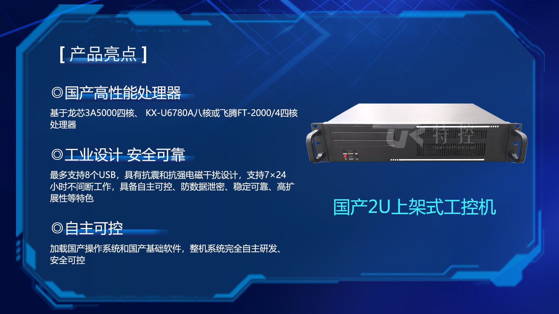 研恒(特控)國產2U上架式工控機基于龍芯3A5000四核、 KX-U6780A八核或飛騰FT2000/4四核處理器,配套國產BIOS, 加載國產操作系統和國產基礎軟件,整機系統完全自主研發、安全可控。最多支持8個USB,具有抗震和抗強電磁干擾設計,支持7×24小時不間斷工作,具備自主可控、防數據泄密、穩定可靠、高擴展性等特色。