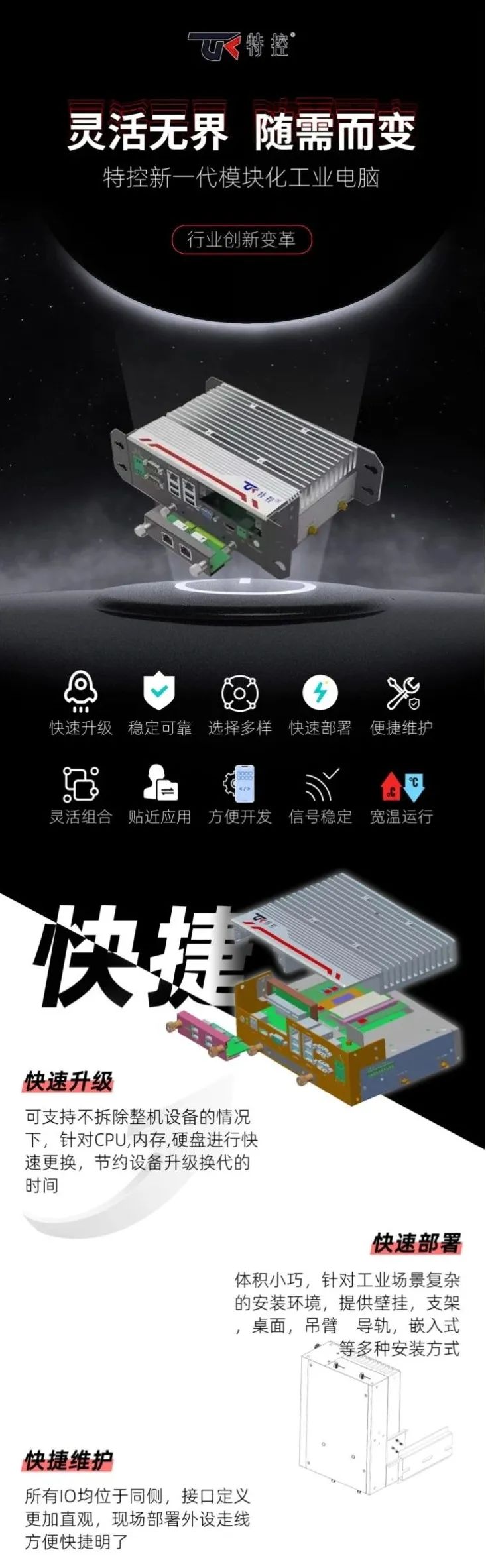 靈活無界,隨需而變,特控新一代模塊化工業(yè)電腦,行業(yè)創(chuàng)新變革。快速升級(jí)、穩(wěn)定可靠、選擇多樣、快速部署、便捷維護(hù)、靈活組合、貼近應(yīng)用、方便開發(fā)、信號(hào)穩(wěn)定、寬溫運(yùn)行。